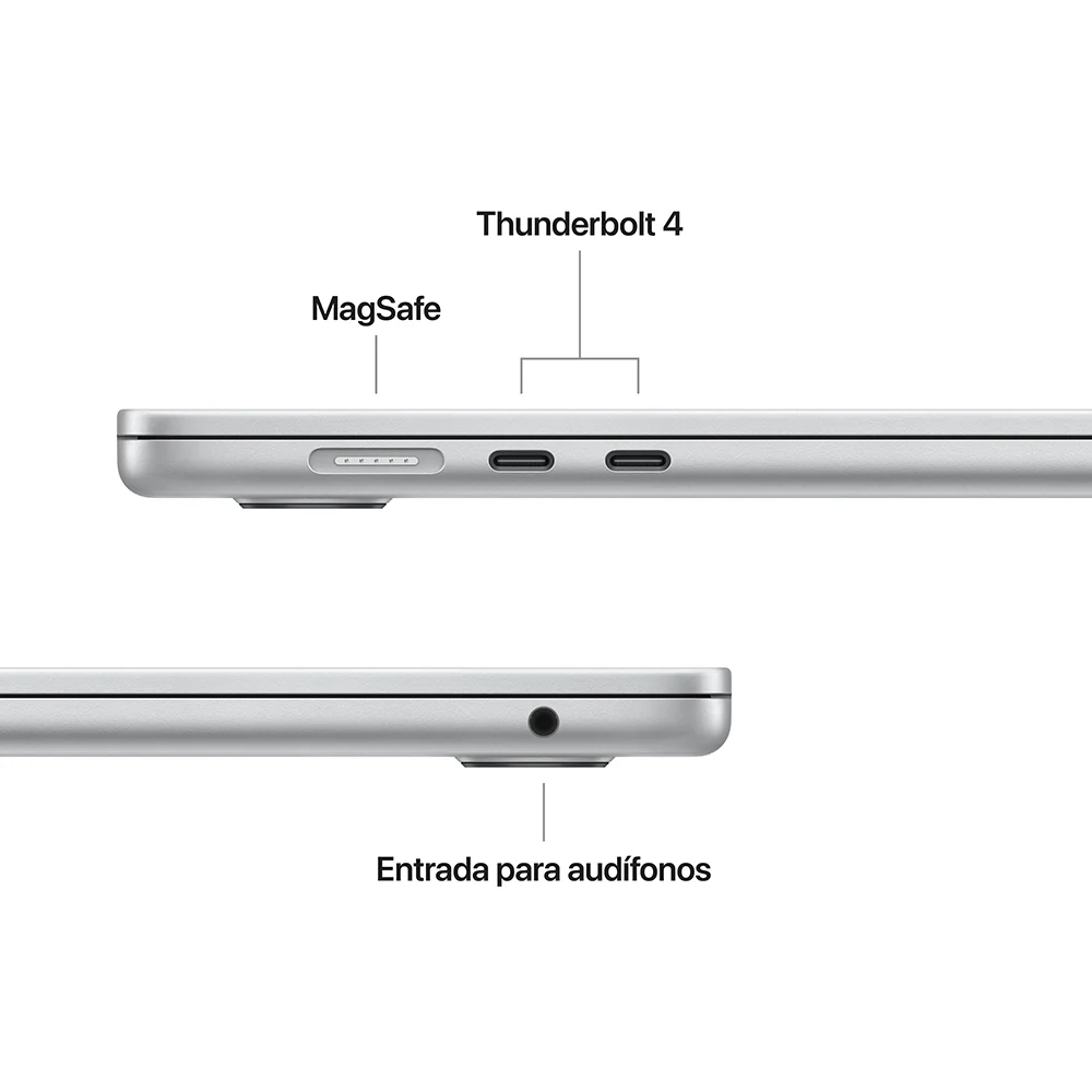 - CONÉCTATE CON TODO — El MacBook Air viene con dos puertos Thunderbolt 4, un puerto de carga MagSafe, una entrada para audífonos, Wi-Fi 6E y Bluetooth 5.3. Y admite hasta dos monitores externos.
